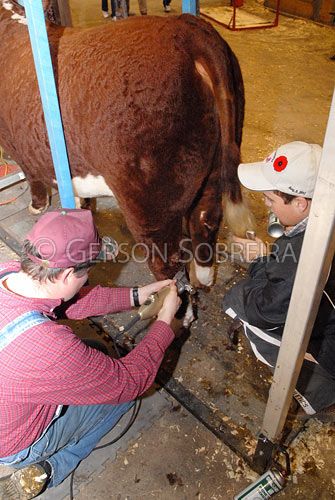 Keywords: Homem, Adulto, Vertical, Exposiçao, Evento, Gado Pecuaria, Bovino, Animal, Royal Winter Fair 2006, Toronto, Ontario, Canada, Gente, Trabalho, Tratador, Manejo, Preparo, Tosquia, Tosa, Tosquiadeira, Toalete, Cortando, Hereford |