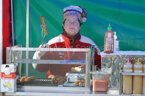 Keywords: Woman, Old aged woman, People, Vienna sausage, Horizontal, Street, Toronto, Ontario, Canada, Urban, Trade, Shop, Shelter tent, Aliment, Feeding, Food, Snack, Hot dog, 2006 |