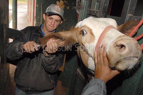 Keywords: Simbrah, Cow, Animal, Hormone, Implant, Applicator, Tool Instrument, Equipment, Horizontal, Cattle Livestock, Bovine, Cambara, Parana, Detail, Handling, Ear, Progesterone, People, Man, Adult, Stem, Immobilized, Pulverize, 2007 |