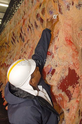 Keywords: Mediçao, Controle, Temperatura, Termometro, Resfriamento, Frio, Camara frigorifica, Carcaça, Animal, Gado Pecuaria, Bovino, Igarape do Meio, Maranhao, Industria, Frigorifico, Gente, Homem, Adulto, Corte, Carne, Vertical, 2007 |