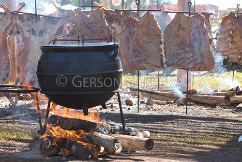 Keywords: Pot, Firewood, Pan, Rib, Bovine, Horizontal, Smoke, Spit, Sheep, Meat, Ground fire, Barbecue BBQ, Preparing, Food, Aliment, Feeding, Parana, Londrina, 2008, Tripod |
