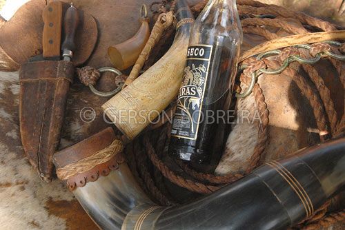 Keywords: Muleteer, Berrante, Cachaça, Guampa, Bottle, Horn, Baggage, Leather, Saddle, Harness, Supplies, Ornament, Object, Aliment, Feeding, Festival Celebration, Queima do Alho, Event, Sao Paulo, 2008, Avare, Horizontal |