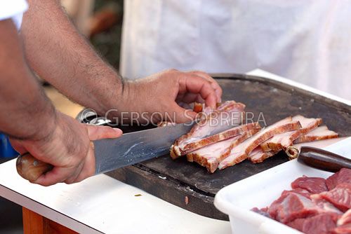 Keywords: Muleteer, Plank, Meat, Bacon, Preparing, Food, Aliment, Feeding, Festival Celebration, Queima do Alho, Event, Sao Paulo, 2008, Avare, Horizontal, Cook, Knife, Cut  |