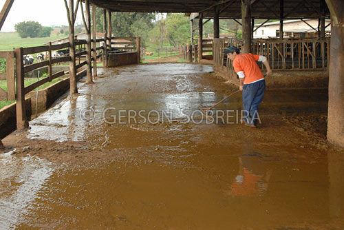Keywords: Man, Young man, Young, People, Manure heap, Manure, Dejecta, Dung, Scat, Dunghill, Palmeira das Missoes, Rio Grande do Sul, 2007, Animal, Cattle Livestock, Bovine, Handling, Horizontal, Rural installation, Shed, Lodging, Free-Stall Free Stall, Cleaning, Water |