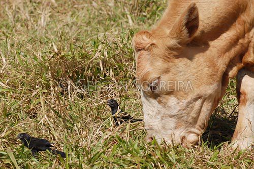Keywords: Simbiose, Vaca, Gado Pecuaria, Bovino, Animal, Horizontal, 2008, Parana, Cambara, Simental, Comendo, Pastando, Pasto Pastagem, Detalhe, Cabeça, Fauna, Ave, Passaro, Nativo, Crotophaga ani, Anu-preto Anu preto, Preto |