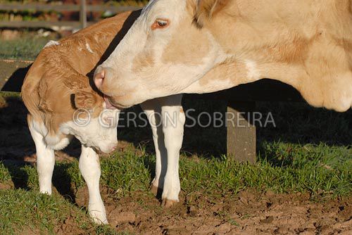 Keywords: Bezerra, Simental, Vaca, Gado Pecuaria, Bovino, Animal, Horizontal, 2008, Sao Paulo, Itapetininga, Tocando, Toque, Lambendo, Lambida |