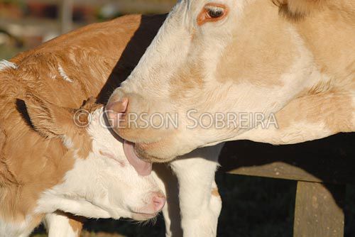 Keywords: Bezerra, Simental, Vaca, Gado Pecuaria, Bovino, Animal, Horizontal, 2008, Sao Paulo, Itapetininga, Tocando, Toque, Lambendo, Lambida  |