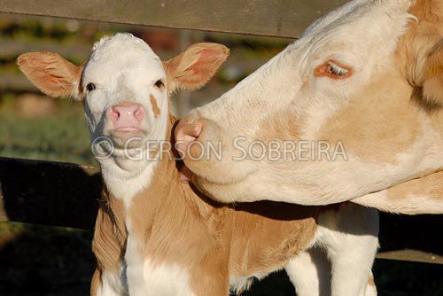 Keywords: Bezerra, Simental, Vaca, Gado Pecuaria, Bovino, Animal, Horizontal, 2008, Sao Paulo, Itapetininga, Tocando, Toque, Lambendo, Lambida  |