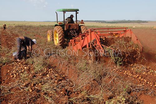 Keywords: Puller, Equipment, Horizontal, 2008, Parana, Florestopolis, Agriculture, Handling, Harvest, Tubercle, Potato, Solanum tuberosum, People, Man, Adult, Job, Rural worker, Land, Ground, Soil, Purple, Dust |