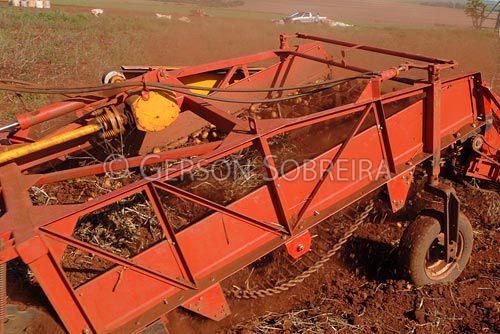 Keywords: Puller, Equipment, Horizontal, 2008, Parana, Florestopolis, Agriculture, Handling, Harvest, Tubercle, Potato, Solanum tuberosum, People, Man, Adult, Job, Rural worker, Land, Ground, Soil, Purple, Dust, Implement |
