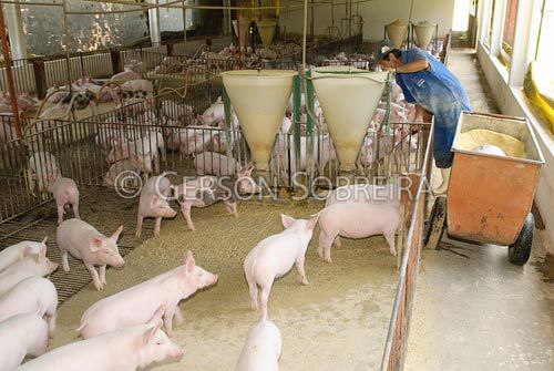 Keywords: Unload, Unloading, Feeder, Ration, Feeding, Handling, Dalland, Swine, Pig, Animal, Arapoti, Parana, 2009, Piglet, Eating, Horizontal, People, Man, Adult |