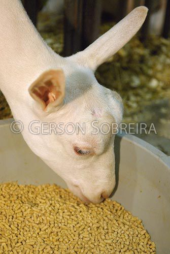 Keywords: Vertical, Pelletized, Industrial, Ration, Head, Detail, Feinco, Caprine, Animal, Sao Paulo, 2009, Saanen, She-goat She goat, Handling, Feeding, Eating |