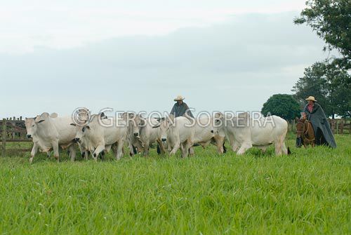 Keywords: Brachiaria decumbes, Braquiaria, Capim, Pastoreio, Pasto Pastagem, Manejo, Touro, Macho, Gado Pecuaria, Bovino, Animal, Santa Fe, 2010, Parana, Horizontal, Nelore, Padrao, Gente, Trabalho, Vaqueiro Peao Cowboy, Homem, Adulto, Conduçao, Conduzindo, Tocando, Movimento, Andando, Tourama, Muar, Mula, Objeto, Apetrecho, Capa de chuva |