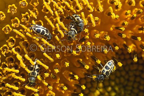 Keywords: Capitulo, Flor, Astylus variegatus, Vaquinha-amarela, Besouro, Horizontal, Macro, Detalhe, 2010, Rio Grande do Sul, Sao Luiz Gonzaga, Agricultura Agricola, Oleaginosa, Girassol, Helianthus annuus, Fauna, Animal, Inseto, Praga |