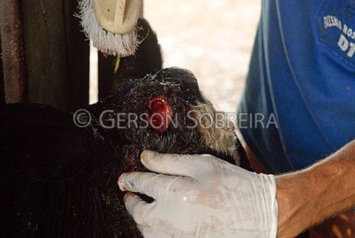 Keywords: Luva, Horizontal, Animal, Gado Pecuaria, Bovino, 2010, Minas Gerais, Uberlandia, Leiteira, Leiteiro, Girolando, Bezerra, Manejo, Limpeza, Assepsia, Tratamento, Curativo, Doença, Inflamaçao, Descornado, Imobilizado, Instalaçao rural, Tronco, Brete, Sabao, Escova |