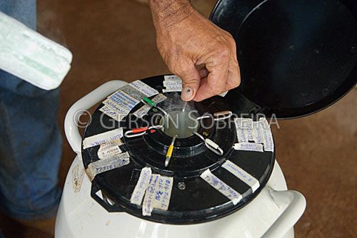 Keywords: Mao, Animal, Semen, Botijao, Objeto, Procura, Procurando, Escolhendo, Gado Pecuaria, Bovino, Minas Gerais, Monte Alegre de Minas, 2010, Horizontal  |