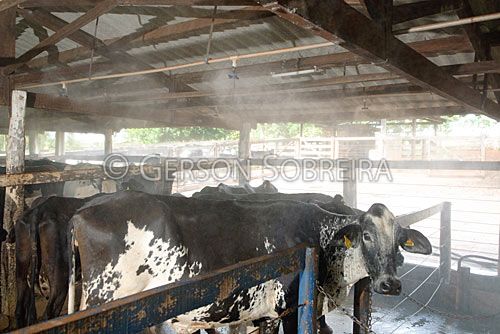 Keywords: Girolando, Dairy, Milkman, Cow, Cattle Livestock, Bovine, Rural installation, Minas Gerais, Monte Alegre de Minas, 2010, Horizontal, Animal, Handling, Comfort Well-being, Spraying, Humidifier, Humidifier, To vaporize, Mist |