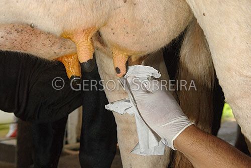 Keywords: Teat nipple, Udder, Animal, Horizontal, 2010, Monte Alegre de Minas, Minas Gerais, Cattle Livestock, Bovine, Cow, Dairy, Milkman, Girolando, Handling, To milk, Pre-dipping Pre dipping, Drying, Towel, Paper, Disinfection, Glove, Hand, People, Man, Adult, Job, Dairy worker, Milker  |