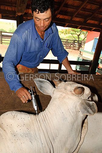 Keywords: Gado Pecuaria, Bovino, Nelore, Animal, Vertical, Vacinando, Aftosa, Homem, Adulto, Vaqueiro Peao Cowboy, Trabalho, Gente, 2011, Parana, Santa Fe, Curral, Manejo, Vacinaçao, Vacina, Seringa, Pistola, Dosadora |