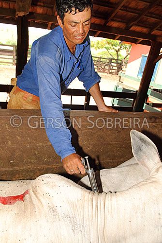 Keywords: Gado Pecuaria, Bovino, Nelore, Animal, Dosadora, Pistola, Seringa, Vacina, Vacinaçao, Manejo, Curral, Santa Fe, Parana, 2011, Gente, Trabalho, Vaqueiro Peao Cowboy, Homem, Adulto, Aftosa, Vacinando, Vertical |