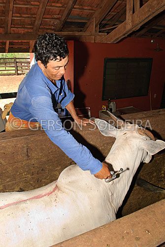 Keywords: Gado Pecuaria, Bovino, Nelore, Animal, Dosadora, Pistola, Seringa, Vacina, Vacinaçao, Manejo, Curral, Santa Fe, Parana, 2011, Gente, Trabalho, Vaqueiro Peao Cowboy, Homem, Adulto, Aftosa, Vacinando, Vertical |