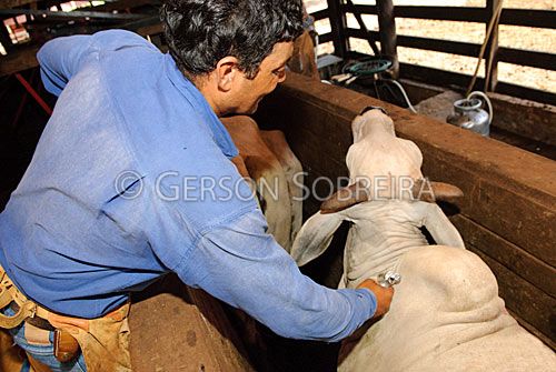 Keywords: Cattle Livestock, Bovine, Nelore, Animal, Vaccinating, Foot-and-mouth Foot and mouth, Man, Adult, Cowpoke Buckaroo Cowboy, Job, People, 2011, Parana, Santa Fe, Corral, Handling, Vaccination, Vaccine, Syringe, Pistol, Doser, Horizontal |