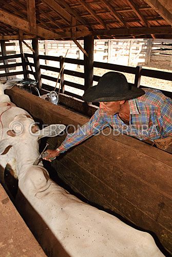 Keywords: Gado Pecuaria, Bovino, Nelore, Animal, Dosadora, Pistola, Seringa, Vacina, Vacinaçao, Manejo, Curral, Santa Fe, Parana, 2011, Gente, Trabalho, Vaqueiro Peao Cowboy, Homem, Adulto, Carbunculo, Vacinando, Vertical |