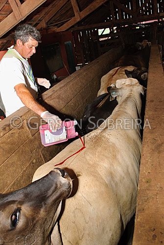 Keywords: Applying, Vertical, Repellent, Pulverize, Haematobia irritans, Horn fly, Man, Adult, Cowpoke Buckaroo Cowboy, Job, People, 2011, Parana, Santa Fe, Corral, Animal, Cattle Livestock, Bovine, Handling, Doser, Cow |