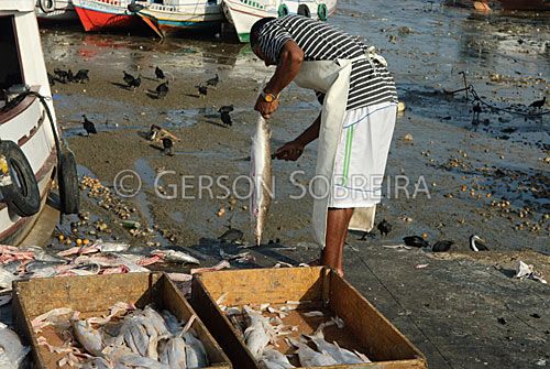 Keywords: Tabuleiro, Sujeira, Resto, Residuo, Pesca, Pescado, Peixe, Rua, Feira, Comercio, Venda, Para, Belem, 2011, Mercado Ver-o-Peso, Agua, Molhado, Desmantelar, Mesa, Faca, Corte, Estripar, Estripando, Limpeza, Limpando, Cortando, Horizontal, Lixo, Urubu, Piraiba, Filhote, Brachyplatystoma filamentosum |
