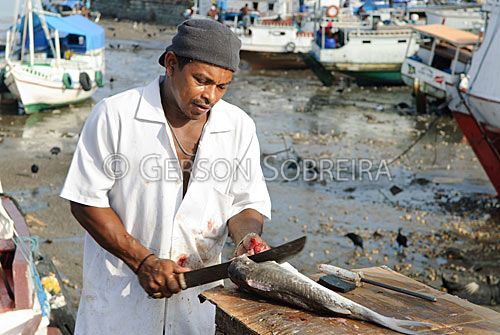 Keywords: Facao, Brachyplatystoma filamentosum, Piraiba, Filhote, Urubu, Horizontal, Cortando, Limpando, Limpeza, Estripando, Estripar, Corte, Mesa, Desmantelar, Molhado, Agua, Mercado Ver-o-Peso, 2011, Belem, Para, Comercio, Venda, Rua, Peixe, Pescado, Residuo, Sujeira |