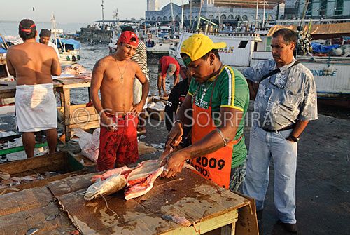 Keywords: Homem, Adulto, Horizontal, Gente, Arius luniscutis, Gurijuba, Faca, Pescado, Peixe, Rua, Comercio, Venda, Para, Belem, 2011, Mercado Ver-o-Peso, Agua, Desmantelar, Mesa, Corte, Estripar, Estripando, Limpeza, Limpando, Cortando |