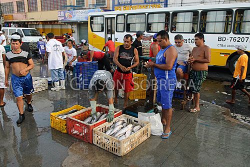 Keywords: Molhado, Equipamento, Balança, Mercado Ver-o-Peso, 2011, Belem, Para, Comercio, Venda, Rua, Peixe, Pescado, Gente, Horizontal, Homem, Adulto, Caixa, Pesando, Peso, Comprando, Negociando, Carregador |