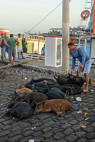 Keywords: Vertical, Man, Adult, People, Ver-o-Peso market, 2011, Belem, Para, Trade, Shop, Animal, Swine, Pig, Hog, Sow, Street, Confined, Tied, Loading |