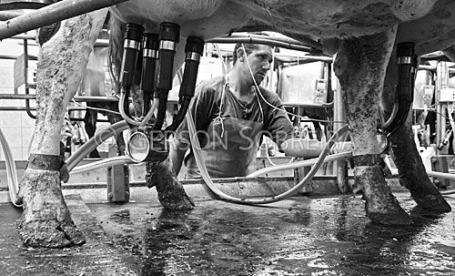 Keywords: Preto e Branco, Ordenhadeira, Equipamento, Ordenhador, Retireiro, Trabalho, Homem, Adulto, Gente, 2011, Horizontal, Parana, Castro, Animal, Gado Pecuaria, Bovino, Vaca, Leiteira, Leiteiro, Holstein, Holandes, Holandesa, Instalaçao rural, Sala de Ordenha |