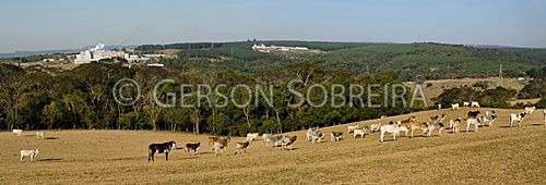 Keywords: Panoramica, Papel de imprensa, Industria, Fabrica, Jaguariaiva, Parana, 2011, Horizontal, Animal, Gado Pecuaria, Bovino, Vacada, Pasto Pastagem, Degradado |