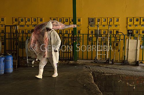 Keywords: 2012, Horizontal, Mercado Central de Goiania, Goias, Comercio, Venda, Carne, Gente, Homem, Adulto, Trabalho, Açougueiro, Carregador, Carcaça |