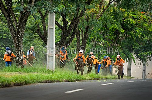 Keywords: Horizontal, Londrina, Parana, 2012, Gente, Homem, Adulto, Cortando, Corte, Poda, Podando, Equipamento, Roçadeira, Costal, Trabalhador, Rua, Grama, Urbano, Grupo, Serviço Publico, Limpeza Publica |