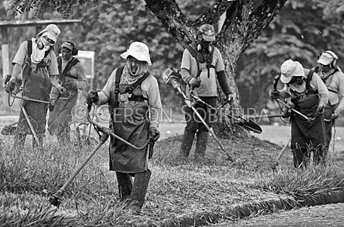 Keywords: Preto e Branco, Limpeza Publica, Serviço Publico, Grupo, Urbano, Grama, Rua, Trabalhador, Costal, Roçadeira, Equipamento, Poda, Podando, Cortando, Corte, Homem, Adulto, Gente, 2012, Parana, Londrina, Horizontal |