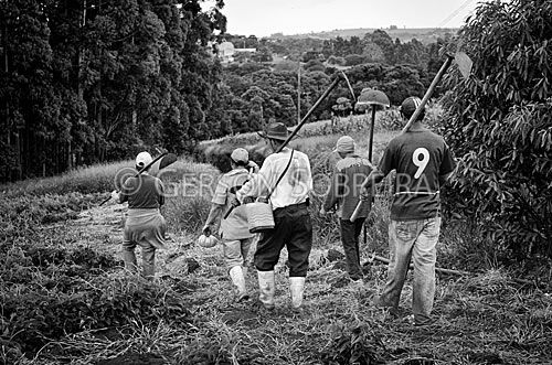 Keywords: Horizontal, Agricultura Agricola, 2012, Parana, Gente, Grupo, Homem, Adulto, Mulher, Adulta, Trabalho, Trabalhador rural, Enxada, Retorno, Andando, Caminhando, Retornando, Preto e Branco |