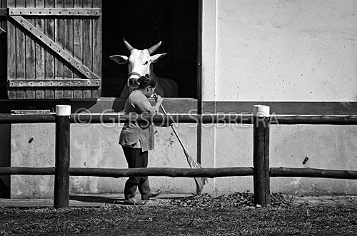 Keywords: Black and white, 2012, Parana, Horizontal, Cambe, Animal, Cattle Livestock, Bovine, Nelore, Rural installation, Shed, Lodging, Stall, People, Woman, Adult, Sweeping, Broom |