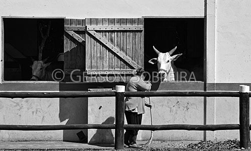 Keywords: Broom, Sweeping, Woman, Adult, People, Stall, Lodging, Shed, Rural installation, Nelore, Cattle Livestock, Bovine, Animal, Cambe, Horizontal, Parana, 2012, Black and white |