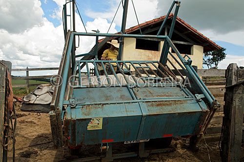 Keywords: Brahman, Gado Pecuaria, Bovino, Animal, Minas Gerais, 2012, Horizontal, Careaçu, Novilha, Casqueamento, Casco, Gente, Homem, Adulto, Casqueador, Equipamento, Brete, Movel |