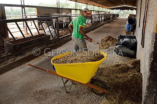 Keywords: Cattle Livestock, Bovine, Animal, Silage, Rake, Fork, Tool Instrument, Equipment, Shed, Marilandia do Sul, 2012, Parana, Horizontal, Rural installation, Man, Adult, Wheelbarrow, Carriole, Load, Loading |