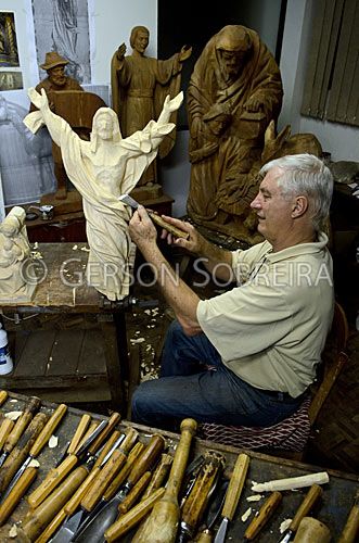 Keywords: Gente, 2012, Santa Catarina, Treze Tilias, Cultura, Arte, Escultura, Madeira, Sacra, Homem, Adulto, Escultor, Esculpindo, Cristo, Vertical |