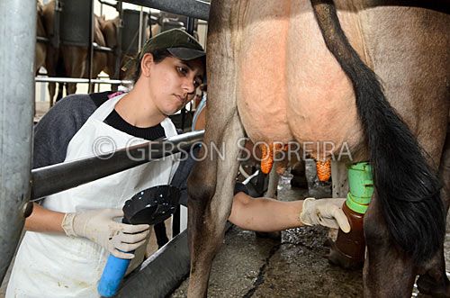 Keywords: To milk, Jersey, Cow, Animal, Milkhouse, Dairy, Cattle Livestock, Bovine, Jandaia, Horizontal, 2012, Goias, Milker, Pre-dipping Pre dipping, Disinfection, Disinfectant |