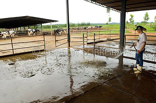 Keywords: Ordenha, Mangueira, Agua, Mulher, Adulta, Limpeza, Limpando, Lavagem, Lavando, Pre-ordenha, Sala de Espera, Instalaçao rural, Inhumas, Goias, 2012, Horizontal |