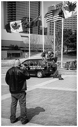 Calling, Flag, Urban, People, Street, Toronto, Black and white, Ontario, Canada, 2004, Vertical, Warning