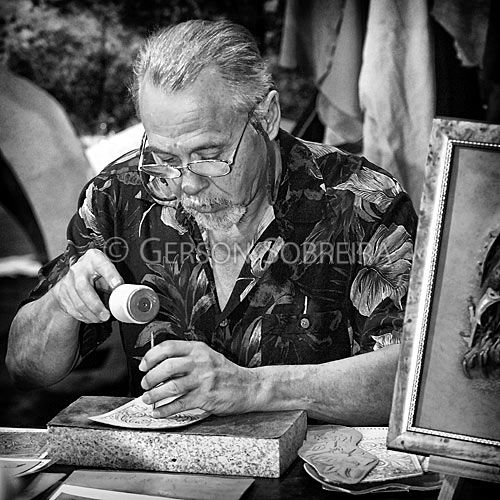 Keywords: Carved work, Leather, Craftsman, Man, Adult, Square, Canada, Ontario, Black and white, Toronto, Royal Winter Fair 2006 |