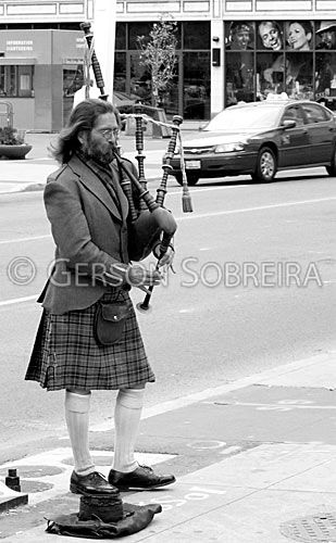 Music, Kilt, Musician, Street, Pipes, Vertical, 2006, Canada, Ontario, Black and white, Toronto