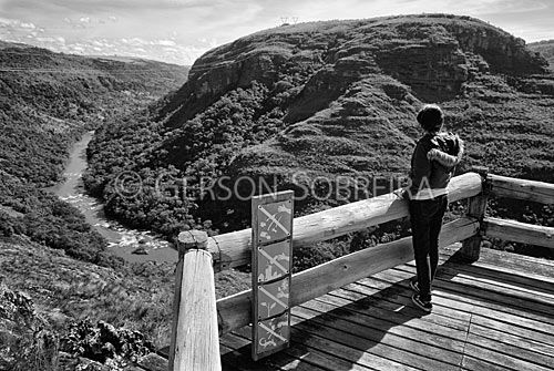 Keywords: Paisagem, Rio Iapo, Escarpa Devoniana, Canyon, Mirante, Tablado, Observando, Campos Gerais, Mulher, Moça, Jovem, Parque Estadual do Guartela, Tibagi, 2010, Parana, Preto e Branco, Horizontal, Turista |